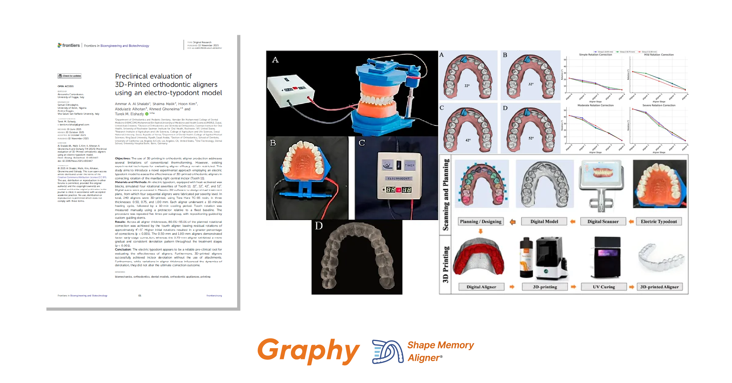 MIAMI, FL, UNITED STATES, December 1, 2025 /EINPresswire.com/ -- A joint study between Graphy Inc. (KOSDAQ: 318060, CEO Unseob Sim) and University of Bonn (Germany) has validated the efficiency and reproducibility of Graphy’s Shape Memory Aligner (SMA) in correcting anterior tooth rotations without the use of attachments. The study introduces a novel preclinical evaluation model utilizing an electro-typodont, allowing quantitative verification of aligner rotational correction efficiency. The results were published as an original research article in Frontiers in Bioengineering and Biotechnology (Q1, IF 4.8) under the special issue “Emerging Technologies in Orthodontic Treatments: 3D Printing, Clear Aligners, and Beyond”, released online in November 2025.