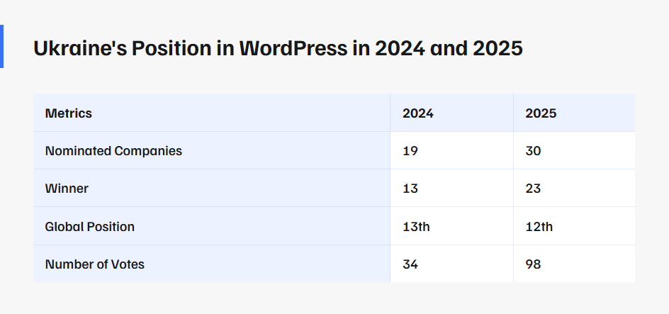 WordPress development was one of the most successful services for Ukraine in 2025, underlining continued demand for scalable and high-performance web solutions. The number of Ukrainian WordPress award winners has grown steadily, reaching 23 winners in 2025, up from 13 in 2024. Ukraine currently counts 191 WordPress providers listed on TechBehemoths and ranks among the leading markets in the region for modern, secure, and cost-effective web development.