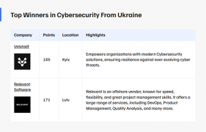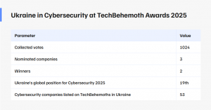 In Cybersecurity, Ukraine also ranked among the notable emerging players by industry engagement, confirming the sustained role of digital security in the country’s tech economy. Out of 53 Ukrainian Cybersecurity companies listed on TechBehemoths, three were nominated, and two became award winners. Compared to 2024, when no companies from Ukraine were nominated or awarded in this category, the 2025 results indicate stricter evaluation standards combined with rapid ecosystem growth and increasing international demand for Ukrainian cybersecurity expertise.